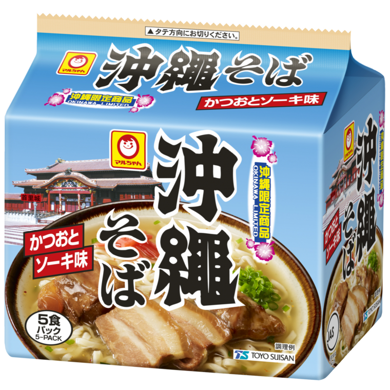 東洋水産の沖縄限定商品「マルちゃん 沖縄そば かつおとソーキ味 5食」です。